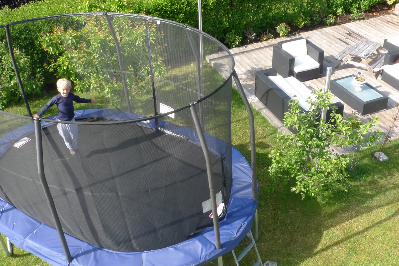 Det er faktisk en av de jeg vurderer å kjøpe. Liker måten sikkerhetsnettet er festet på innsiden av beskyttelseskanten. Og så er det kjekt at det er plass nok til en voksen også. Juhu!!!! Men må vente til hagen har kommet litt mer i orden, så jeg ser om det bli rund eller oval. Kos dere med lange lyse kvelderr i hagen. Kos dere i lys